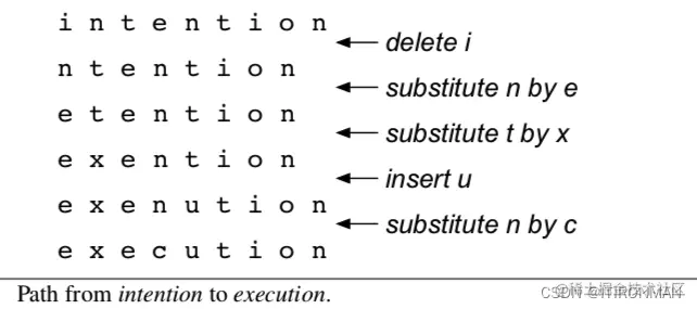 编辑距离为我们提供了一种量化这两种关于字符串相似度的直觉的方法。更正式地说,两个字符串之间的最小编辑距离定义为将一个字符串转换为另一个字符串所需的最小编辑操作(插入、删除、替换等操作)数量。