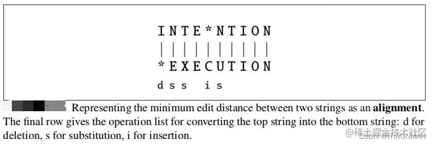 如上,图中第一行字符串和第二行字符串分别是对比的两串,两行字符串中间的竖线表示的是这两串字符挨个字符进行对比并对齐,对齐的过程中肯定有字符不一样的,那这个时候,第三行字符表示该字符对比后是需要删除(d)还是替换(s)还是插入(i)。