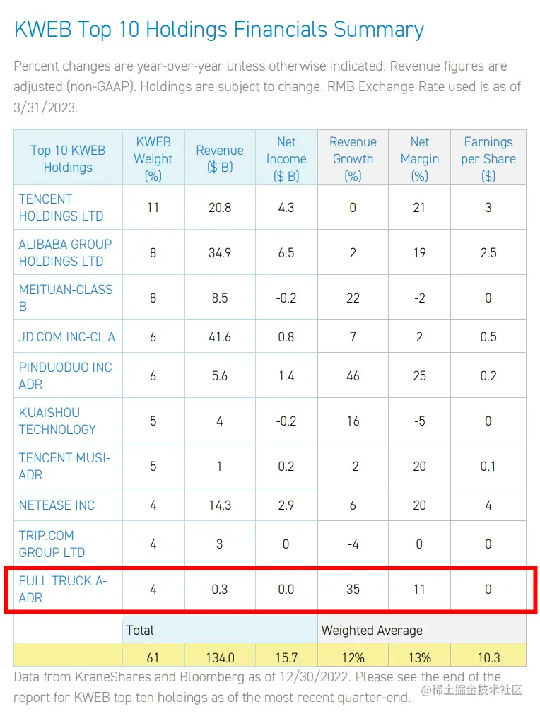 截至去年年底, 满帮是KWEB的十大重仓股之一,KWEB也即KraneShares CSI China Internet ETF,主要跟踪中证海外中国互联网指数,投资于海外上市的一系列互联网和新经济企业。