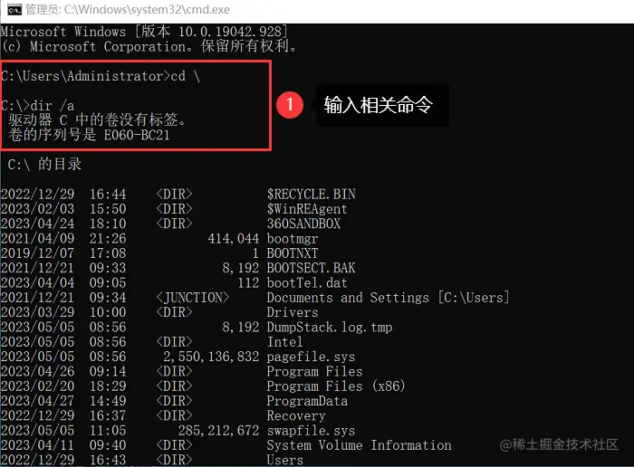 - 在命令提示符中,输入 【cd \】 以进入根目录,然后输入 【dir /a】 以显示所有文件和文件夹,包括隐藏的文件;