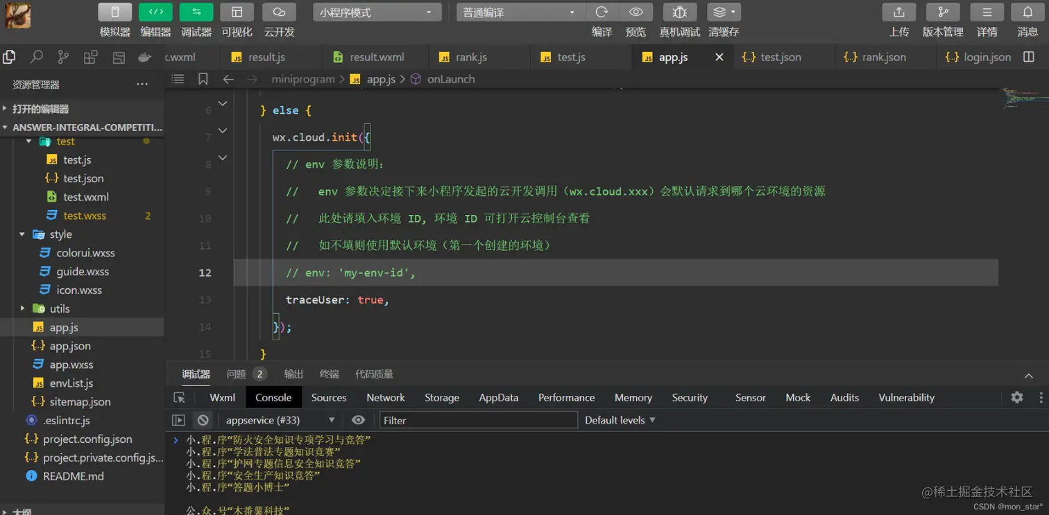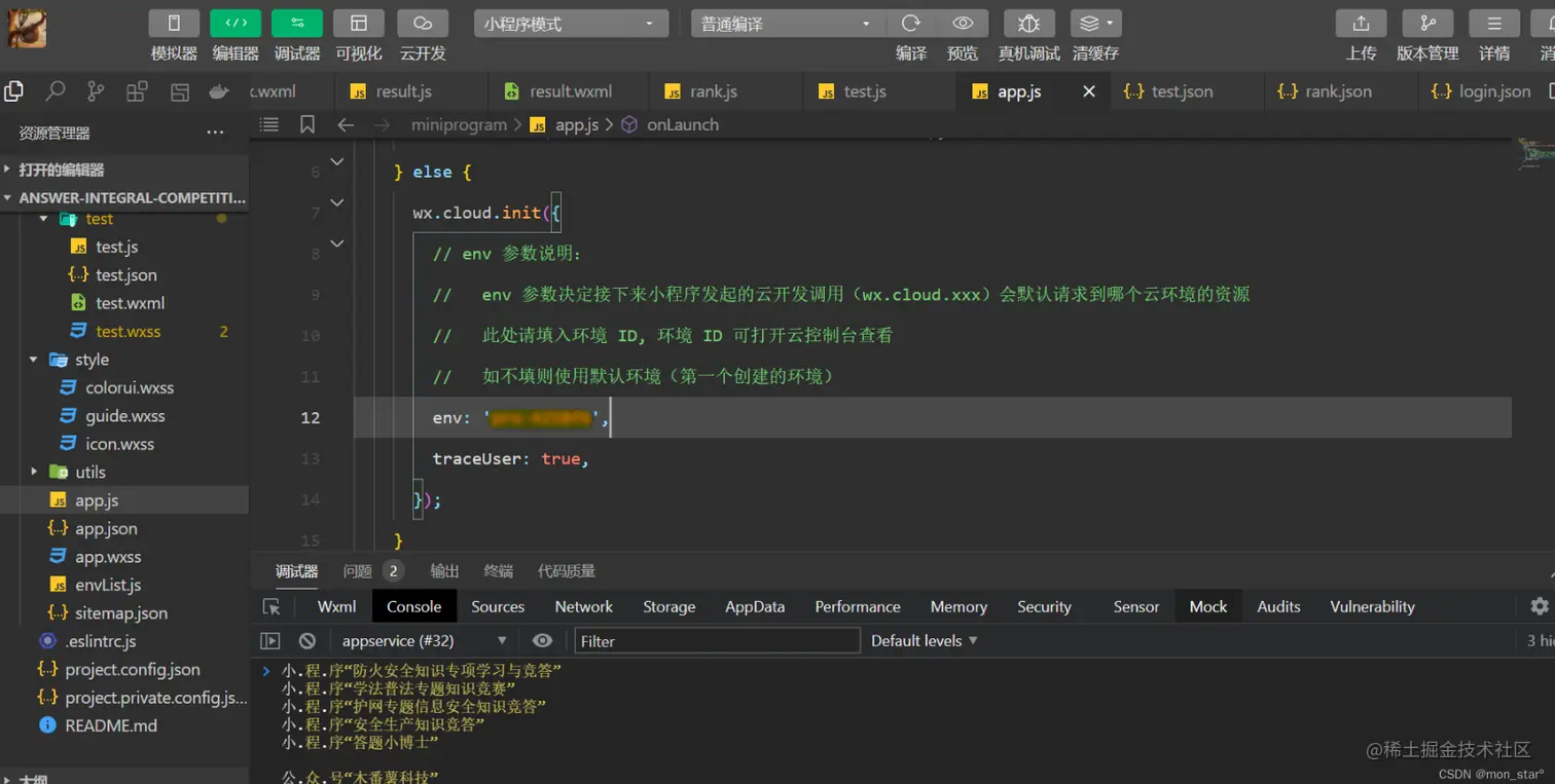 需要在小程序端配置环境ID,打开app.js文件,将刚刚复制的环境ID,粘贴到app.js的env配置项;