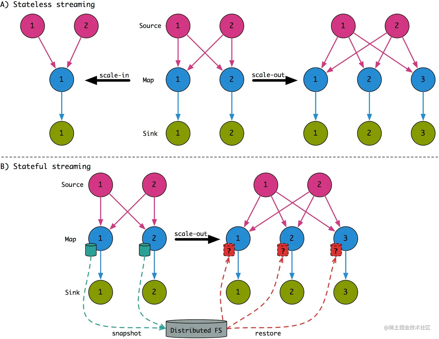 官方的图片,上面的是无状态的flink 任务扩缩容,下图是有状态flink 任务,checkpoint的时候,会将状态 snapshot到外置分布式存储系统中(rocksdb, s3, hdfs 等),同时扩缩容的时候,需要考虑相关状态如何分发。