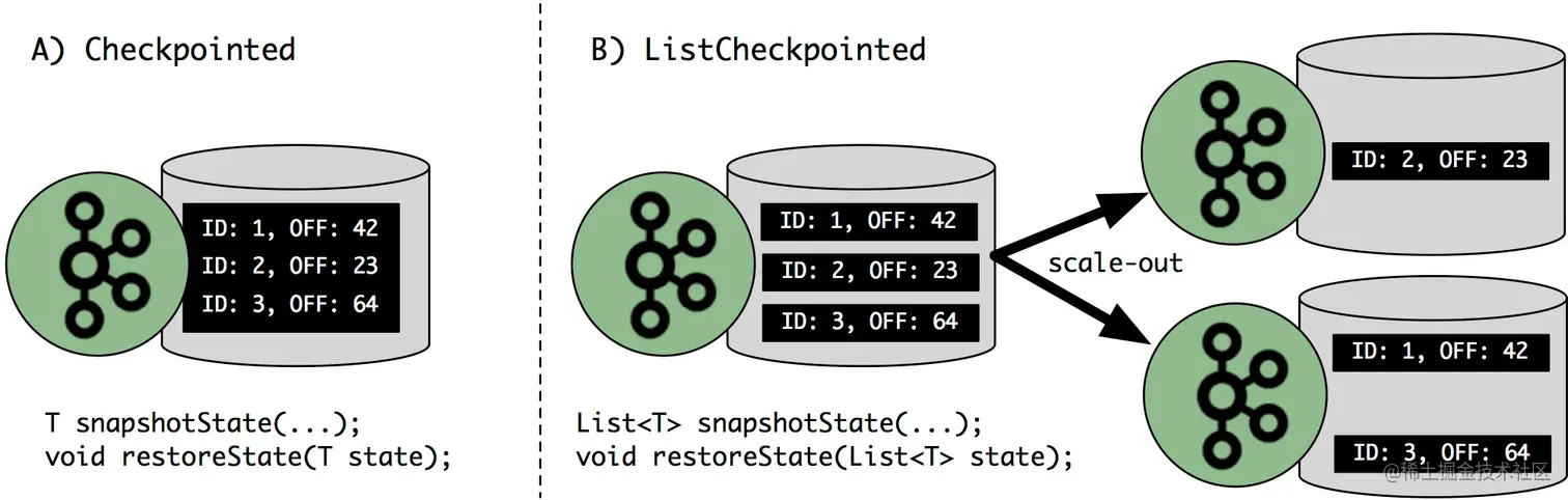 官方这里举的例子是 flink kafka consumer 状态,记录了小的kafka topic 以及相关offset,在扩缩容的时候,需要在相关task分配具体状态。