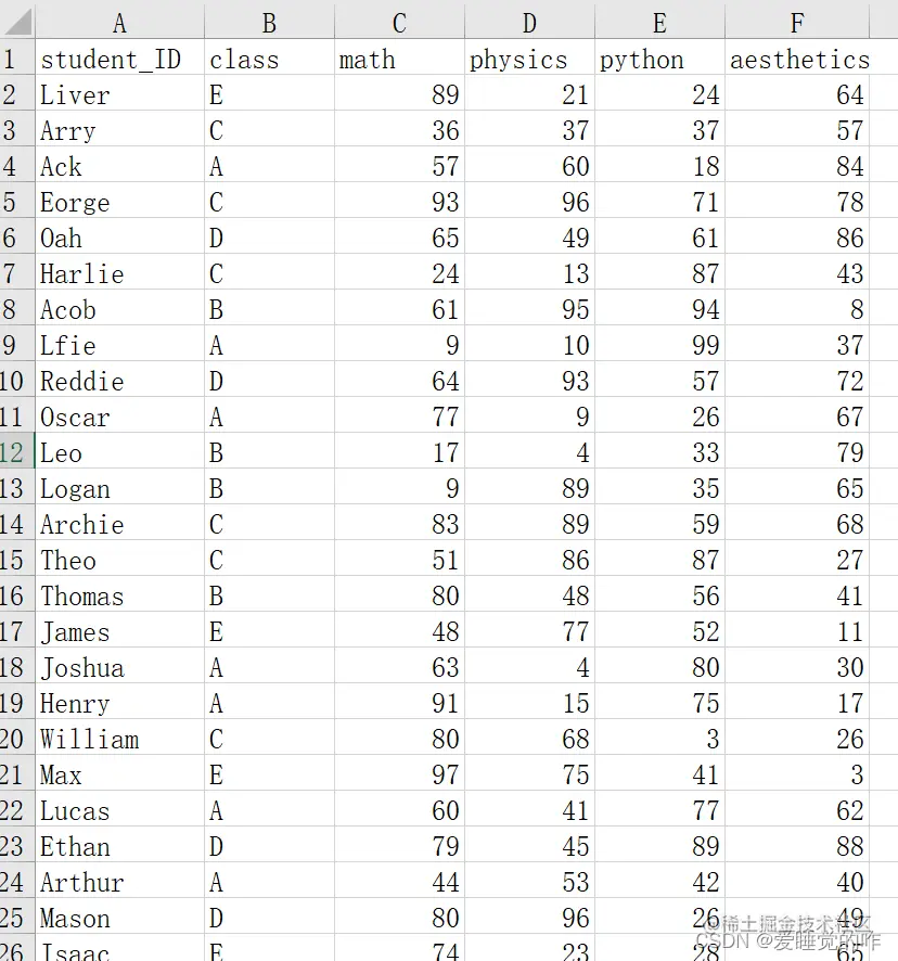 以下可视化的数据来源为“transcript.xlsx”成绩单文件,他有六列,分别是学生姓名、班级、数学科目得分、体育科目得分、python语言得分、美学科目得分。基于这个数据表,进行数据处理和可视化操作。