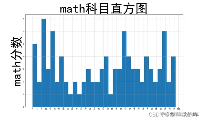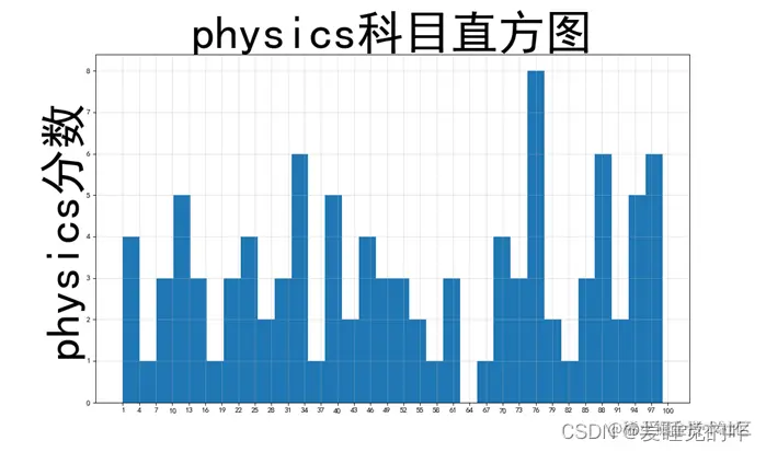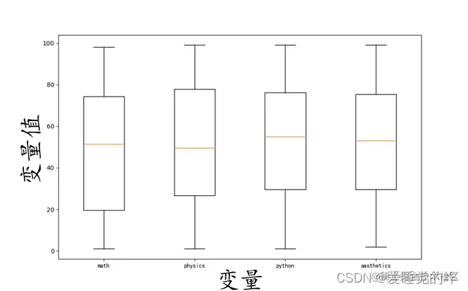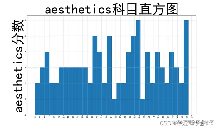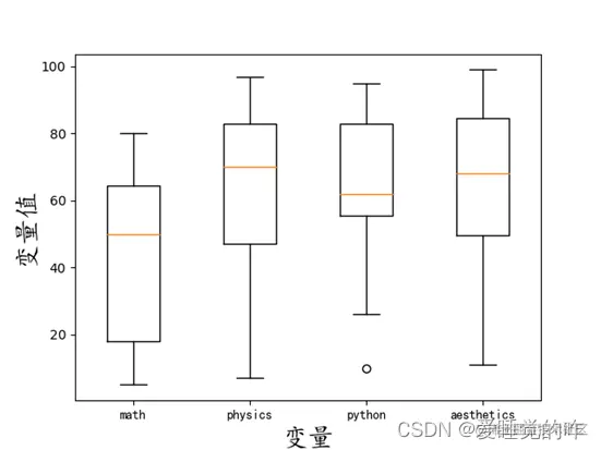 - 绘制各个科目的直方图时,设置了一个d组距,将最大值减去最小值除以组距作为num_bins,用plt进行画图,设置网格使效果更加直观。绘制各个科目的分数分布箱线图,label = 'math', 'physics', 'python', 'aesthetics'设置横轴每个箱图对应的横坐标