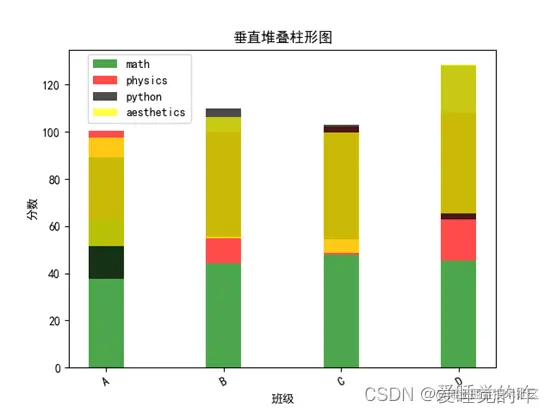 - 绘制垂直堆叠柱形图时,plt.bar()中注意设置bottom参数是从上一个科目上开始的,这样才能够达到堆叠的效果。