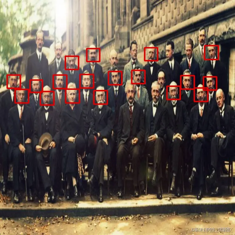- 接着,我们检测图片中的人脸,face_detect.detectMultiScale,就是调用模型里面的detectMultiScale。第一个参数gray是要处理的图片,第二个参数是,第三个参数28意思是检测的时候,30次都在同一个位置检测到人脸;这个值高,模型就需要反复验证。第四个参数是。第五个参数是最小矩形框大小,第六个参数是最大矩形框大小。这六个参数需要自己去调,以求最佳匹配。detectMultiScale方法会直接用该模型检测图片,并返回多个x,y,w,h。(x,y)是左顶点的坐标,w是矩形框的宽度,h是矩形框的高度。
