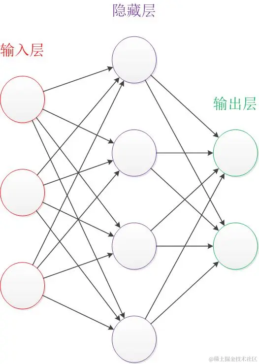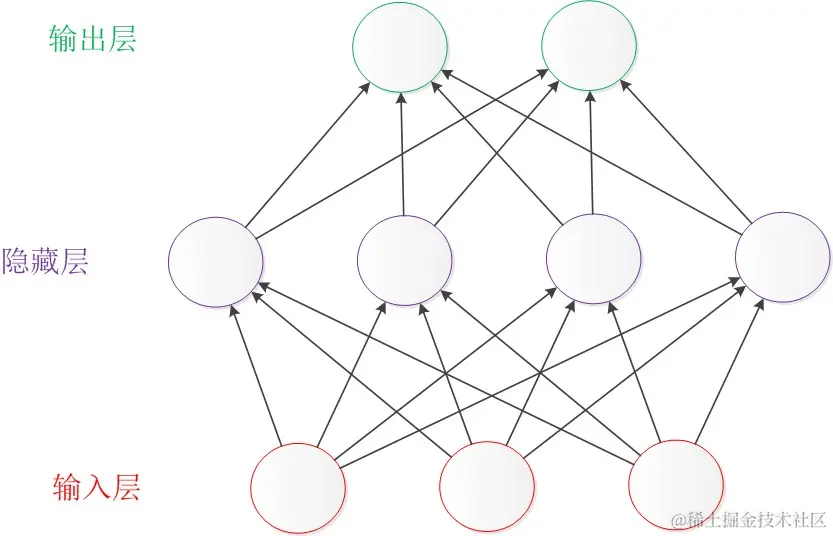 首先让我们来看一个经典的神经网络。这是一个包含三个层次的神经网络:输入层、中间层(也叫隐藏层)、输出层。