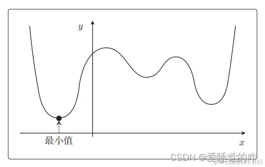 用最速下降法来找函数的最小值时,必须先要决定从哪个 x 开始 找起。之前我们用 g(x) 说明的时候是从 x = 3 或者 x = −1 开始的,这是我们随便选择的,选用随机数作为初始值的情况比较多。不过这样每次初始值都会变,进而导致陷入局部最优解的问题。假设这张图中标记的位置就是初始值:
