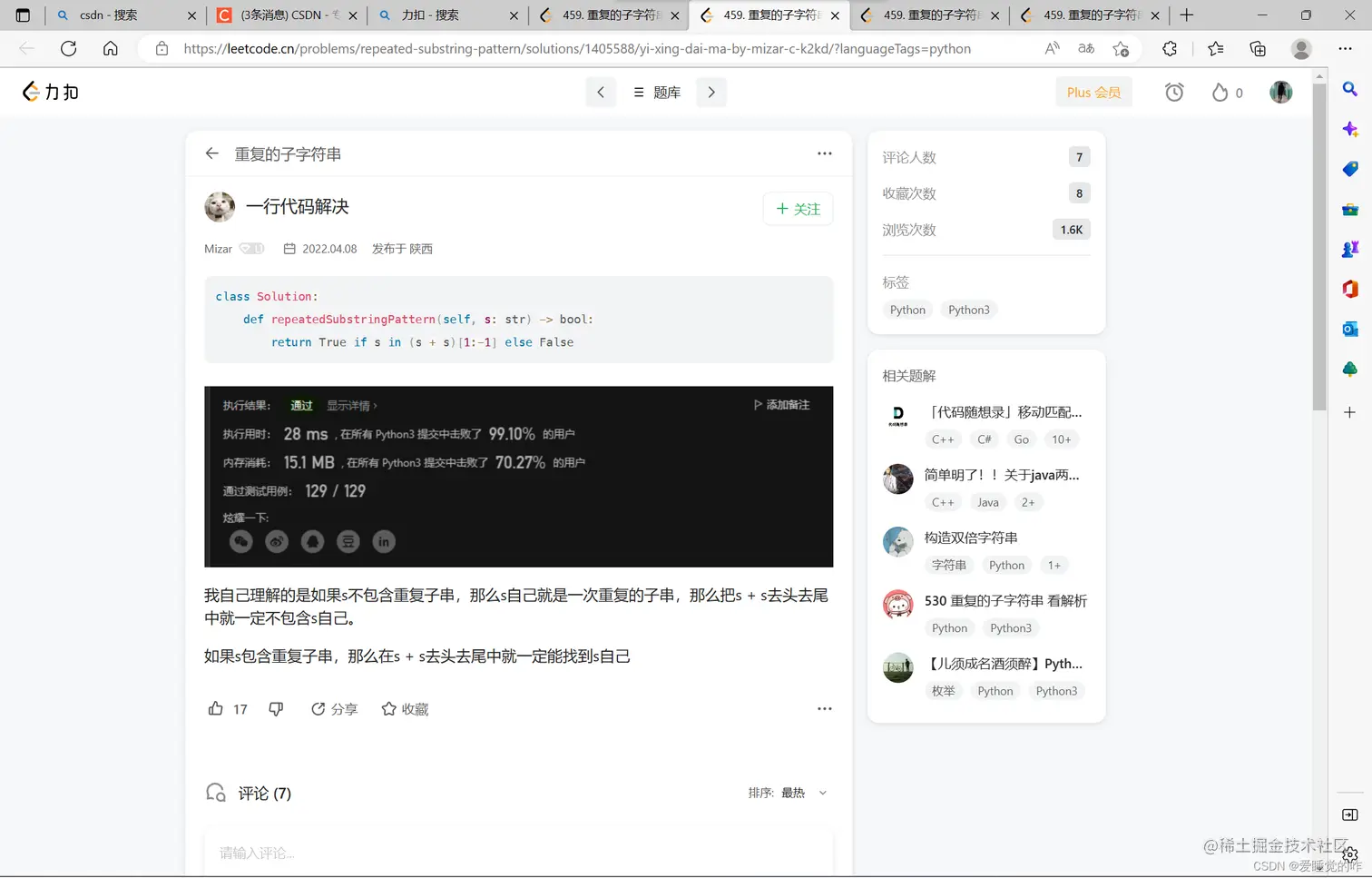 如果s包含重复子串,那么在s + s去头去尾中就一定能找到s自己,这样的做法真的很巧妙!记住了!