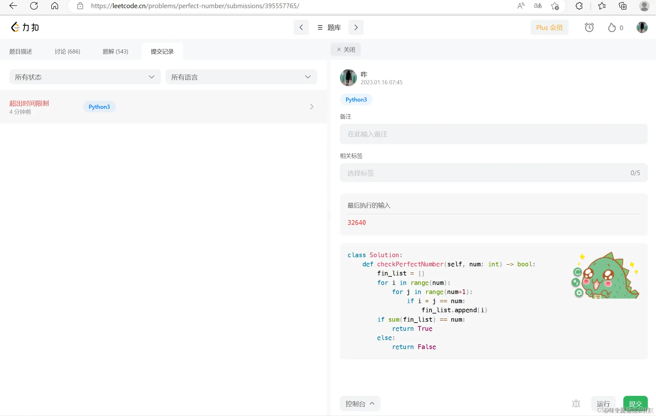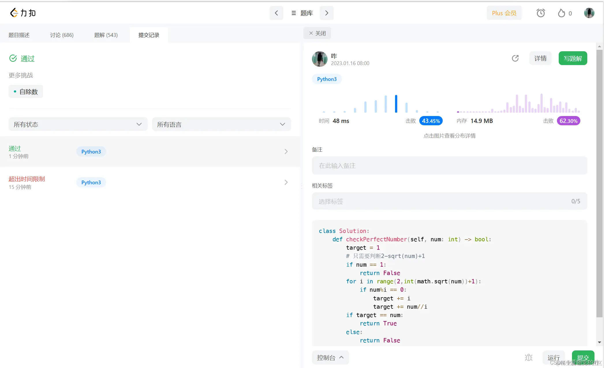 果然,超出了时间限制,看来得降低时间复杂度。实际上我们只需要判断2-int(math.sqrt(num))+1就可以了,添加的时候也不要用列表添加了,改成数字相加,这样能大大优化时间复杂度。