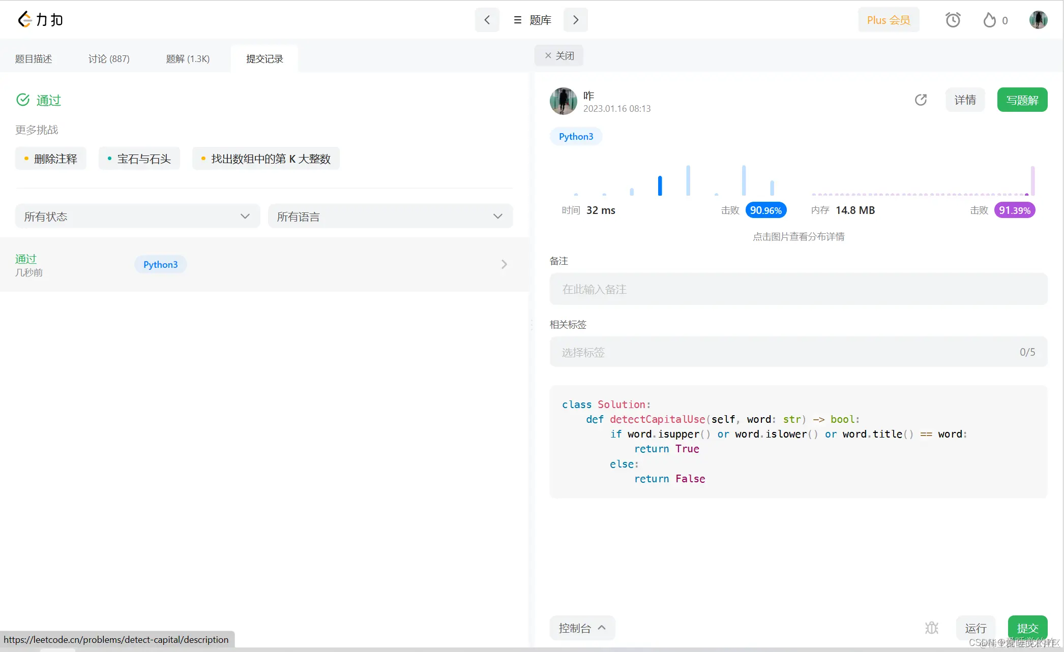 将符合要求的情况转化为大写字母,好在python字符串提供了相应的API,直接调用就可以,内存和速度表现的都很不错。