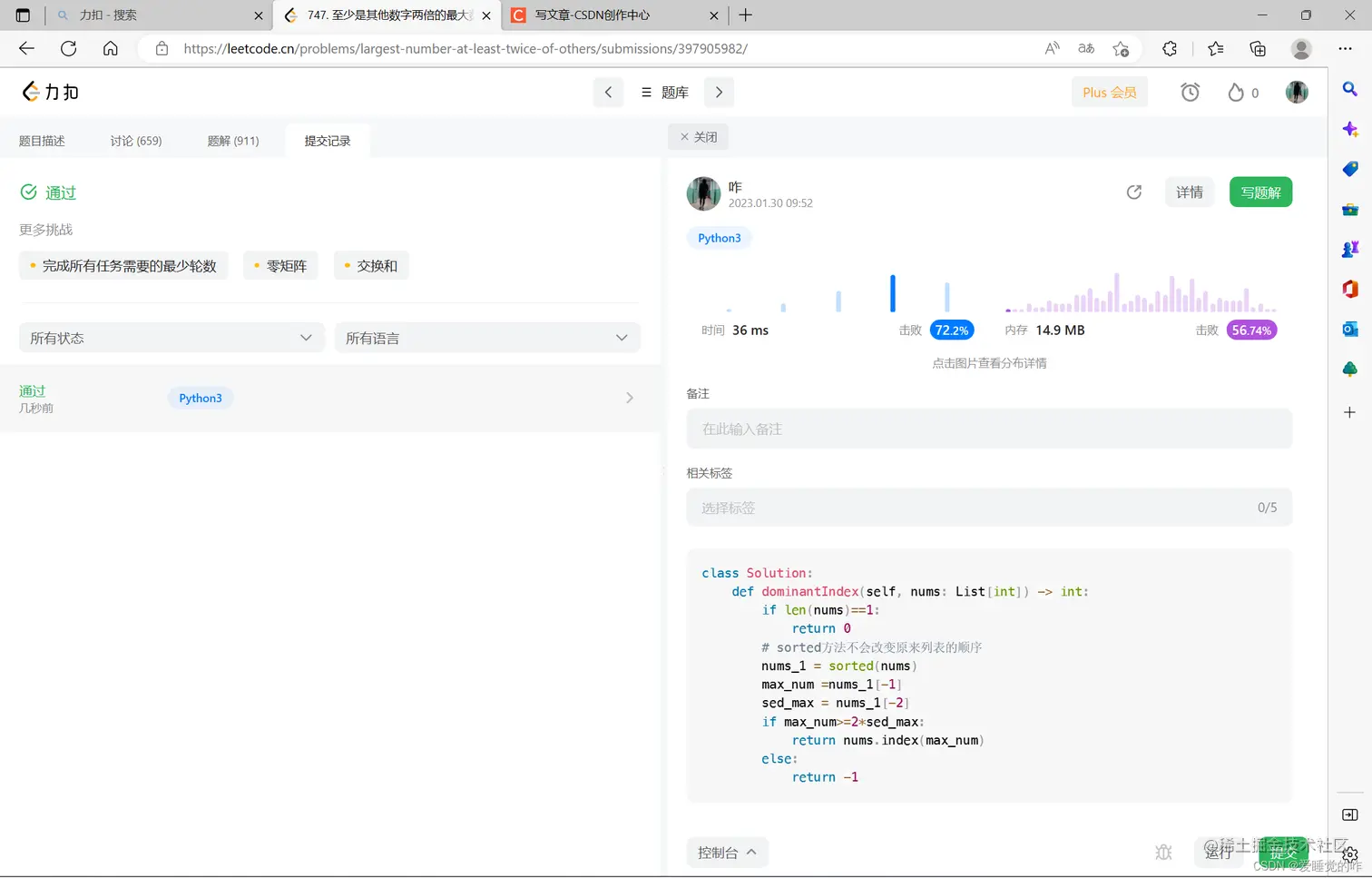 用sorted方法对列表排序,不会改变原来的列表的顺序,方便之后index索引。只要比较最大值和倒数第二大值之间的关系就可以了。
