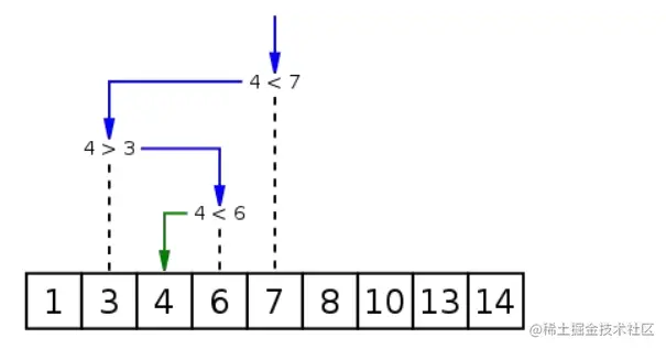 - 首先,假设表中的元素是按升序排列的,将表中间位置记录的关键字与查找关键字比较,如果两者相等,则查找成功;否则利用中间位置记录将表分成前后两个子表。
