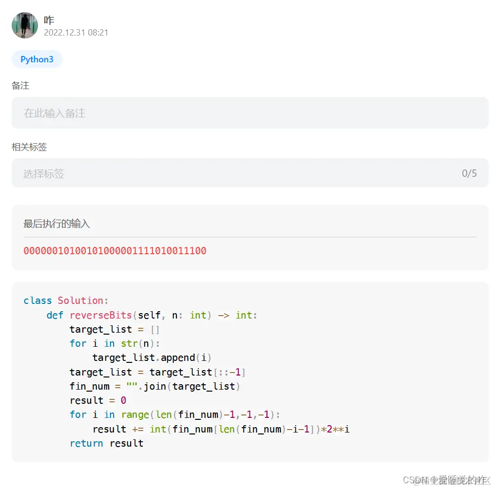 经过长时间的摸索发现,力扣给的整数不是真正意义上的整数,需要用bin函数进行接收,可以理解成,给的是一个十进制的数字,需要先转成二进制才能进行操作,所有我们需要先用bin转化: