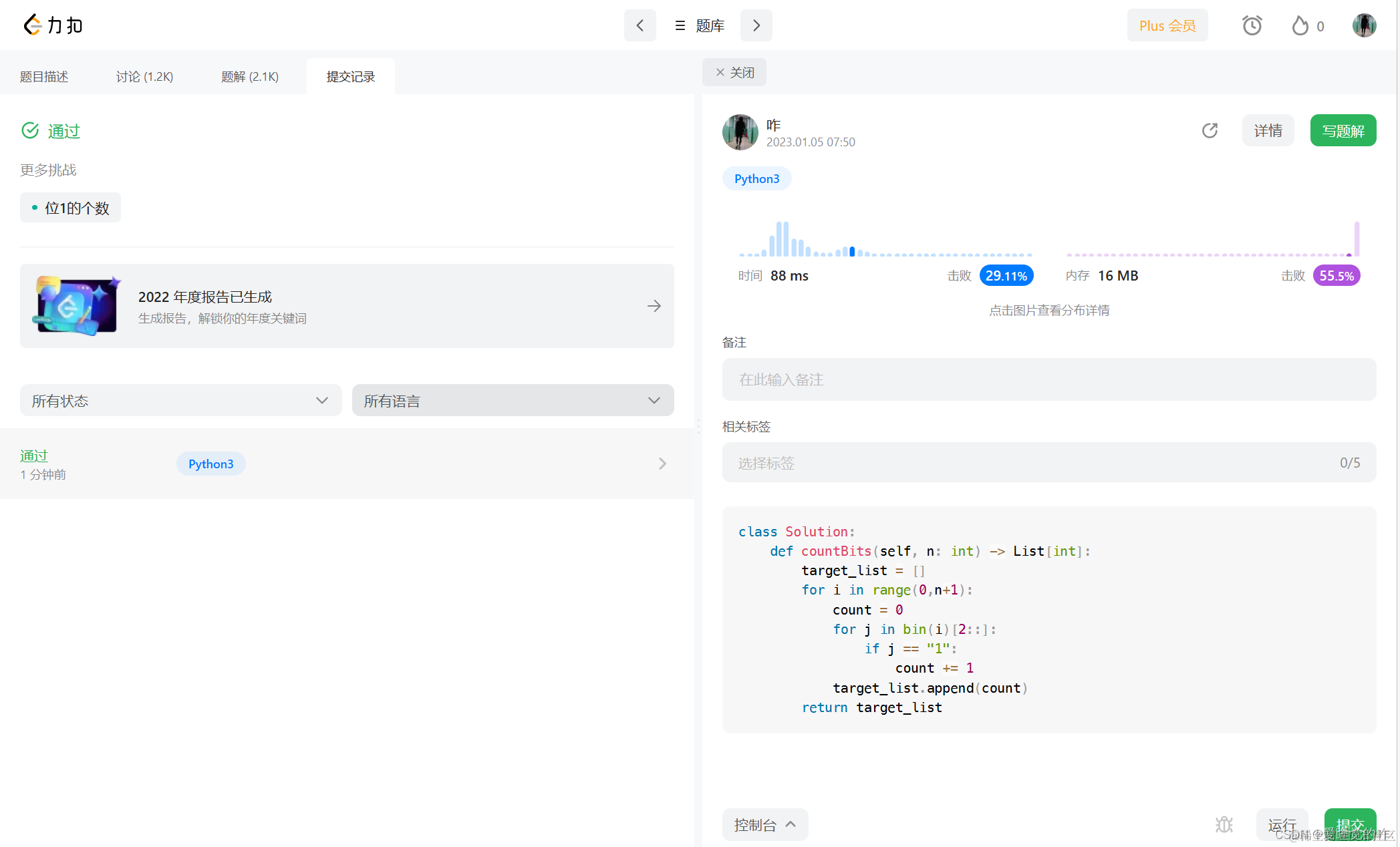 首先需要拿到小于等于n的每一个整数,所有需要一个循环,然后就是用二进制将这些数字表示出来,可以用bin函数,注意需要截取一下,然后就是判断是否是1,如果是的话count+1,内循环没结束一次count置零,重新开始计数。将每次的结果存在列表中,最终返回这个列表。