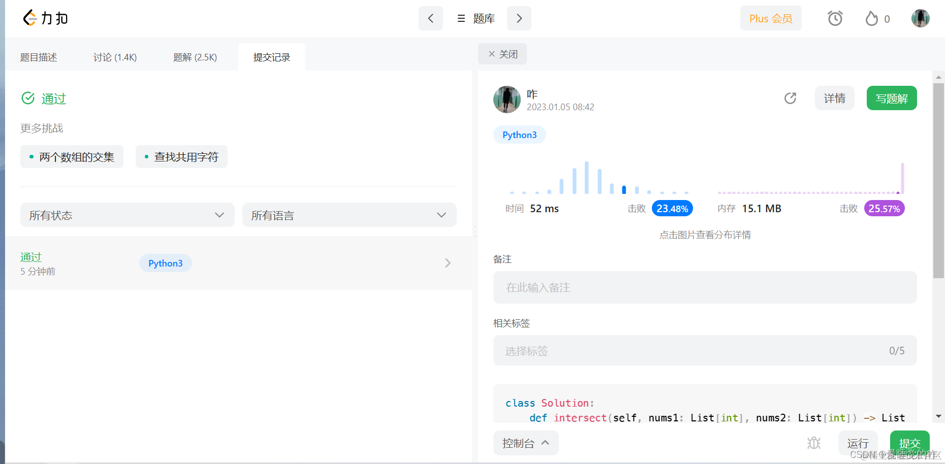 和之前写的1一样,首先用集合找到两者的交集。如果没有交集的话直接返回空列表。然后就是看看有没有重复的元素需要添加到列表中,用count函数去数,如果某个数在两个列表中都出现了一次以上,则以最小值为准,讲这个最小值与 1做差,看需要添加多少个重复的元素。最后将结果返回就可以了。