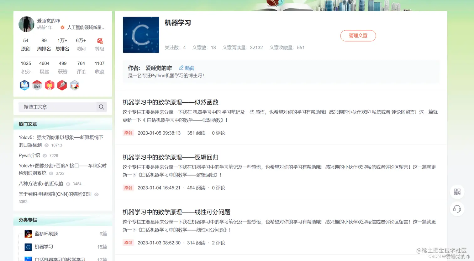 到现在我已经更新了55篇原创的博客啦!有四千多个粉丝,人工智能领域新星创作者,这些都是对我莫大的鼓励!但我知道道阻且长,自己只是一个普通的大学生,和一些行业大佬还是没法比的。特别喜欢CSDN年度报告里面的一段话:写博客是一场厚积薄发的沉淀。真的很沉淀自己,很多东西只有写下来才不会那么轻易的遗忘,在这个过程中,你得思考怎么和别人讲清楚,我觉得这是一件很难的事情。