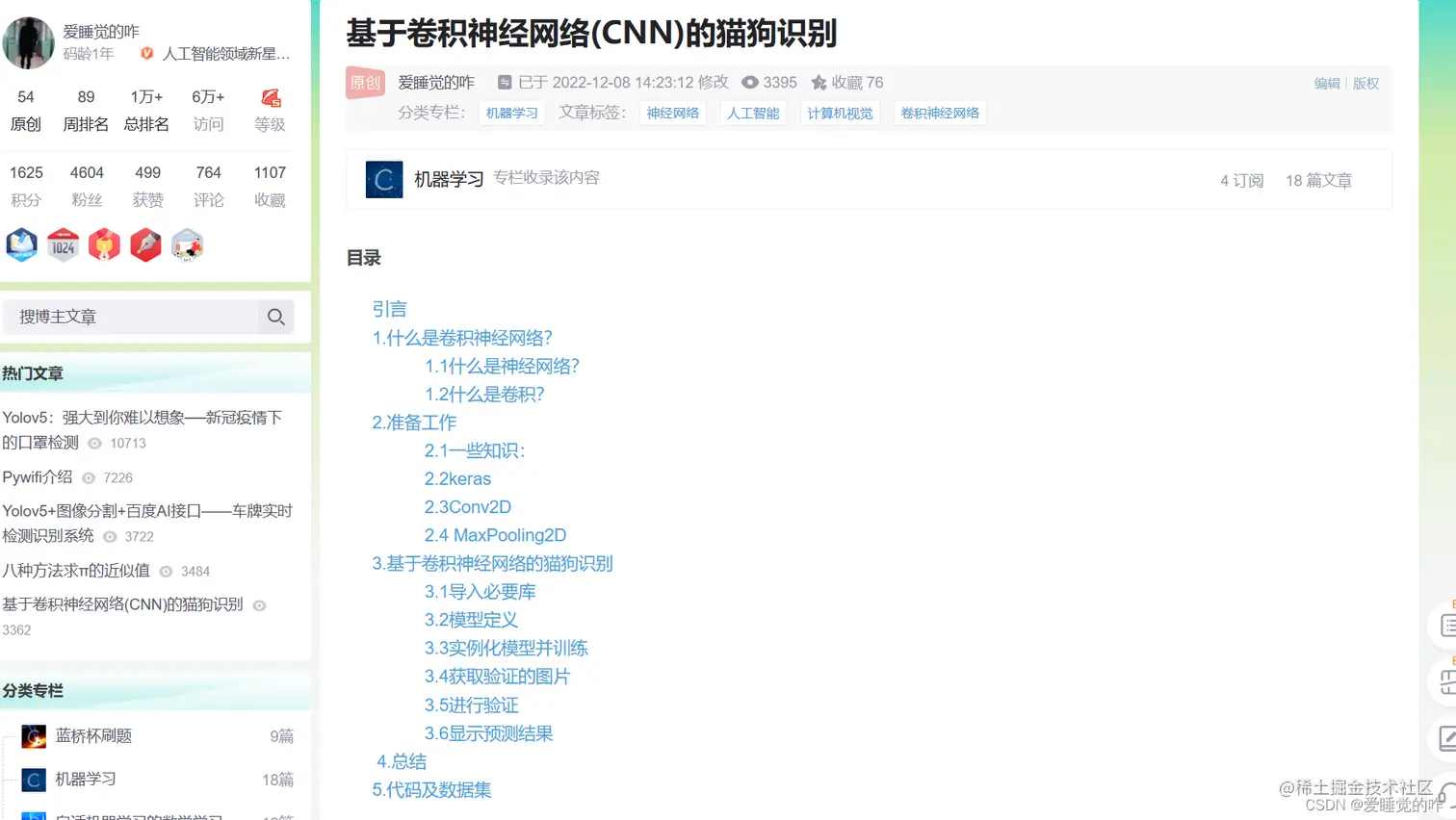10月3日,我的第一篇博客诞生了——《基于卷积神经网络CNN的猫狗识别》,这是我第一次接触机器学习,当时是跟着B站上的教学视频一行一行代码敲出来的。