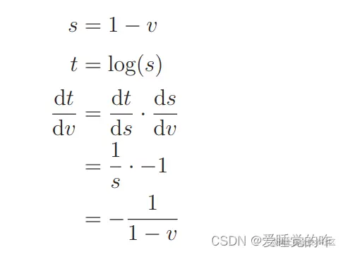 这个是 u 对 v 微分,log(v) 的微分是 1/v。对 log(1 − v) 微分时,要像这样通过复合函数来求。还 要注意,这样做最后的表达式前面会有个负号。