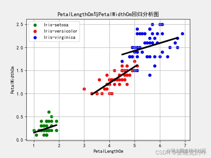 - 由参考图可知,需要分类别进行回归分析,即Iris-setosa、Iris-versicolor、Iris-virginica三个属性要分别进行回归分析,这就要求在读取文件后,对数据进行预处理。用df.loc可以 指定列读取指定内容,例如:PetalLengthCm_Iris_setosa = df.loc[df["Species"]=="Iris-setosa",["PetalLengthCm"]]。