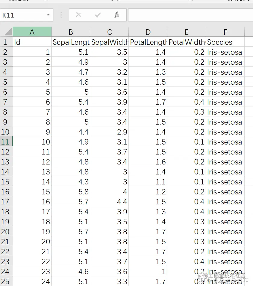 - 在读取数据时,ID列和标签列不能读入,所以这里用pd.read_csv时要限制读取列:data=pd.read_csv('iris.csv',usecols=["SepalLengthCm","SepalWidthCm","PetalLengthCm","PetalWidthCm"])