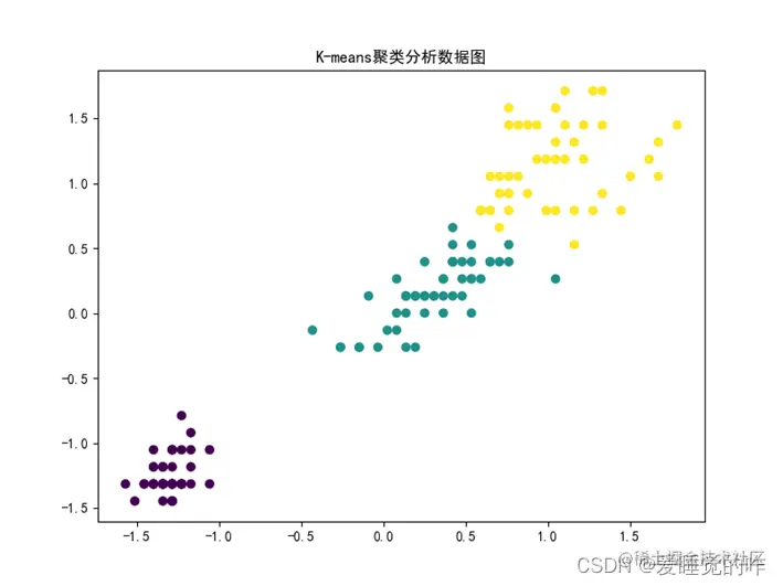 - Kmeans聚类,我这里n_clusters=3,即聚成三类,每一类用不同的颜色标注出来,最后加上标题,保存并显示出来。