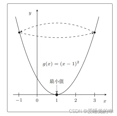 在 x < 1 时,g(x) 的图形 向右下方延伸,反之当 x > 1 时,g(x) 的图形向右上方延伸,换句话说就是从左下方开始延伸的。 x = 3 这一点,为了使 g(x)的值变小,我们需要向左移动x,也就是必须减小 x。如果是在另一侧的 x = −1 这一点,为了使 g(x) 的值变小,我们 需要向右移动 x,也就是必须增加 x。