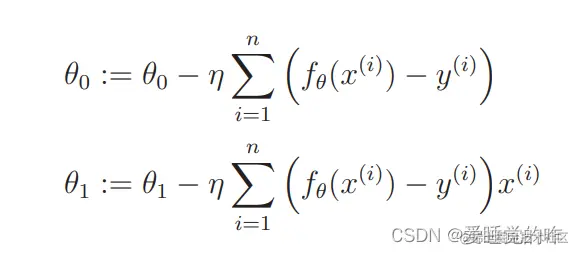 fθ(x)拥有 θ0 和 θ1 两个参数。 也就是说这个目标函数是拥有 θ0 和 θ1 的双变量函数,所以不能用 普通的微分,而要用偏微分。如此一来,更新表达式就是这样的: