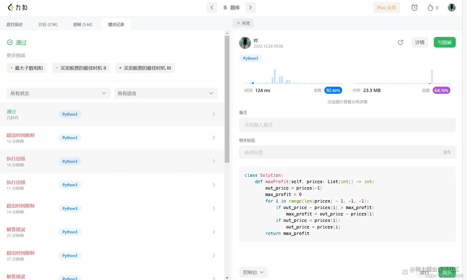 没辙,看看其他大神的题解吧!动态规划!好吧,我还没有学过,能理解多少理解多少吧。首先要求卖出的价格与买入的价格的最大值,我们可以倒着看,如果卖出价格确定的话,收益最大的就是买入价格最低的时候,并且我们用max_profit不断接受我们的利润,如果之后有利润大于当前的利润,我们就进行更新。从后向前遍历,如果当前价格高于出价,则用当前价格代替出价,这样一直遍历循环,时间复杂度为O(n)。