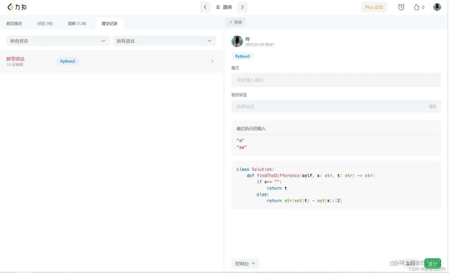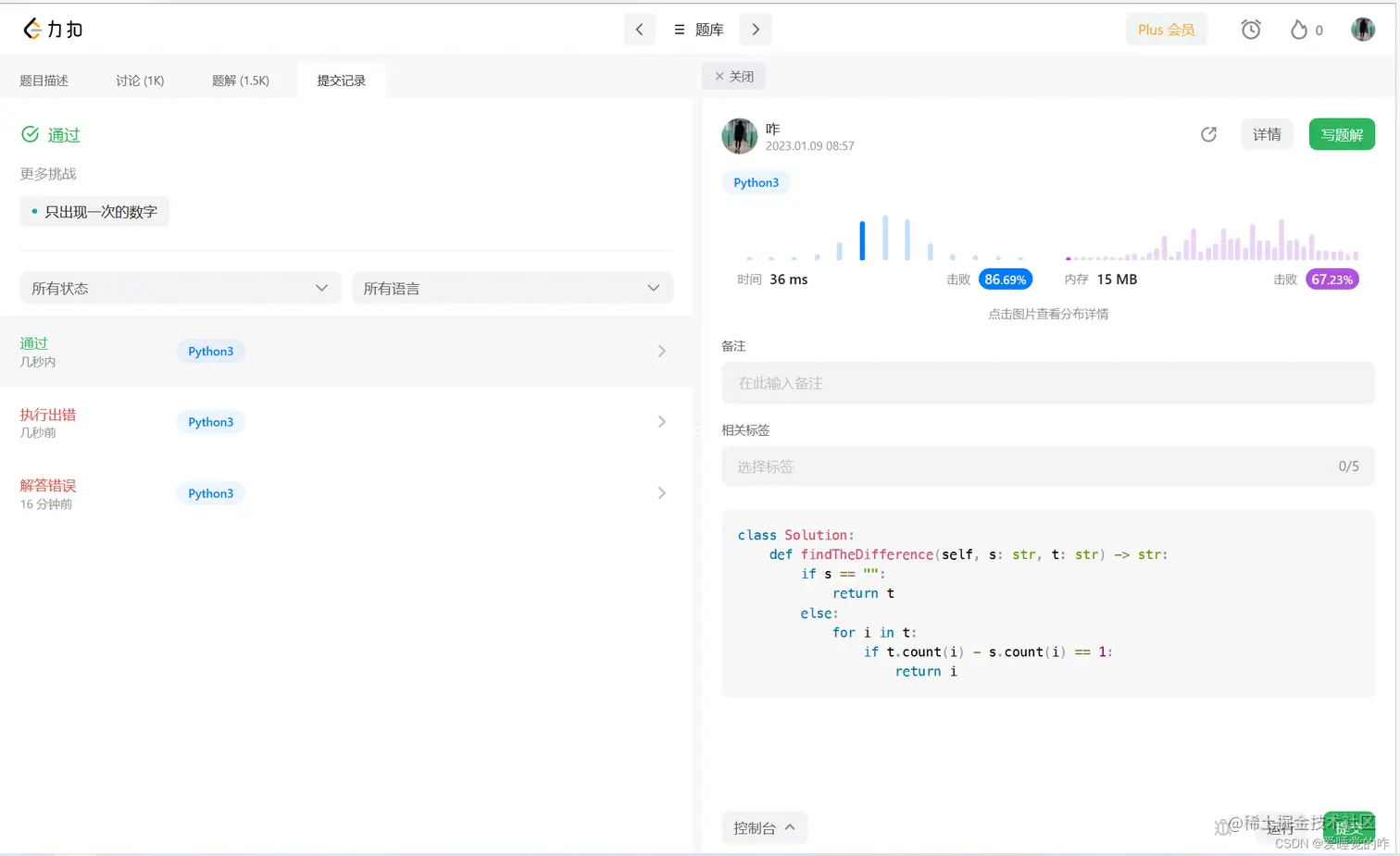 忽略了如果添加的元素本身就在原来的字符串中出现的这种情况,所以还是用暴力循环来写,遍历t,如果t中的i出现次数比s中多一次,那么这个i就是后来添加的元素。