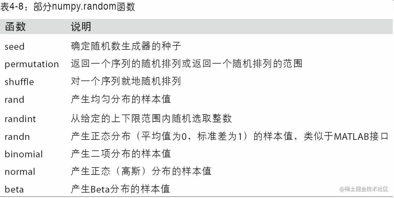我们说这些都是伪随机数,是因为它们都是通过算法基于随机数生成器种子,在确定性的条件下生成的。你可以用NumPy的np.random.seed更改随机数生成种子: