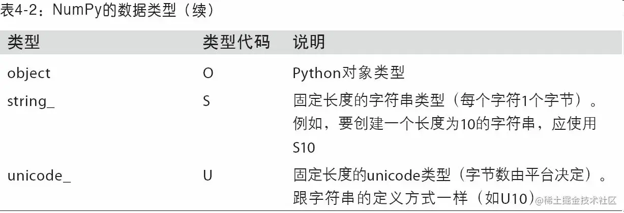 除非特别说明,np.array会尝试为新建的这个数组推断出一个较为合适的数据类型。数据类型保存在一个特殊的dtype对象中。比如说,在上面的两个例子中,我们有: