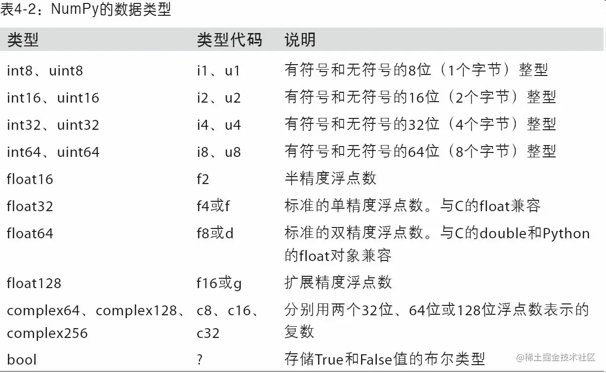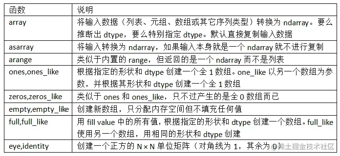 表4-1列出了一些数组创建函数。由于NumPy关注的是数值计算,因此,如果没有特别指定,数据类型基本都是float64(浮点数)。