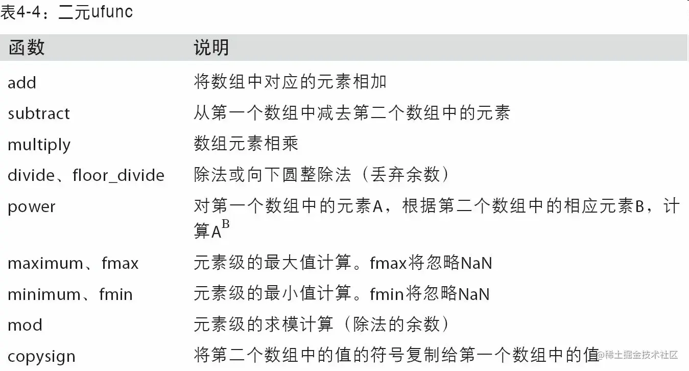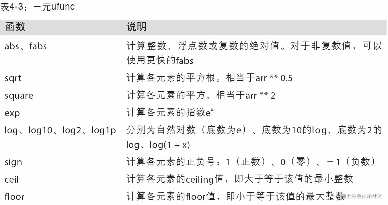 - 用于对整组数据进行快速运算的标准数学函数(无需编写循环)。