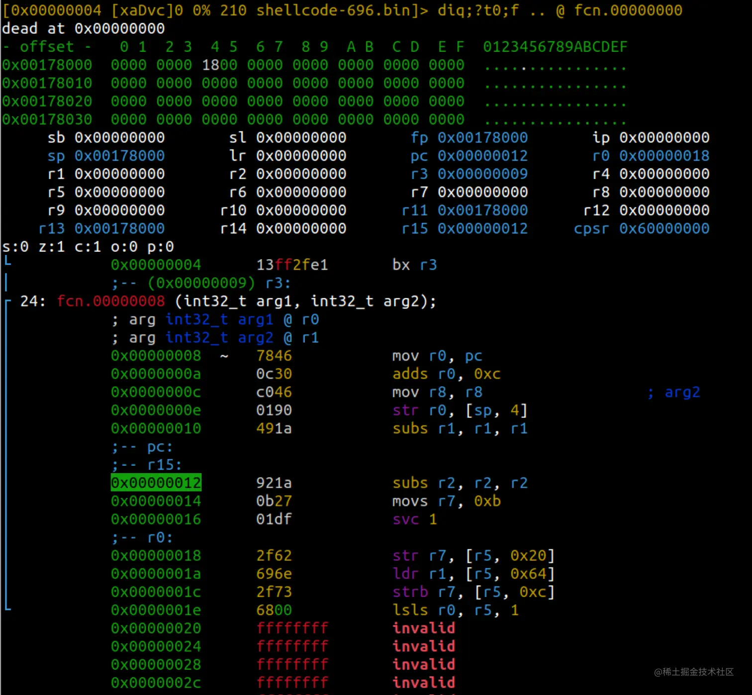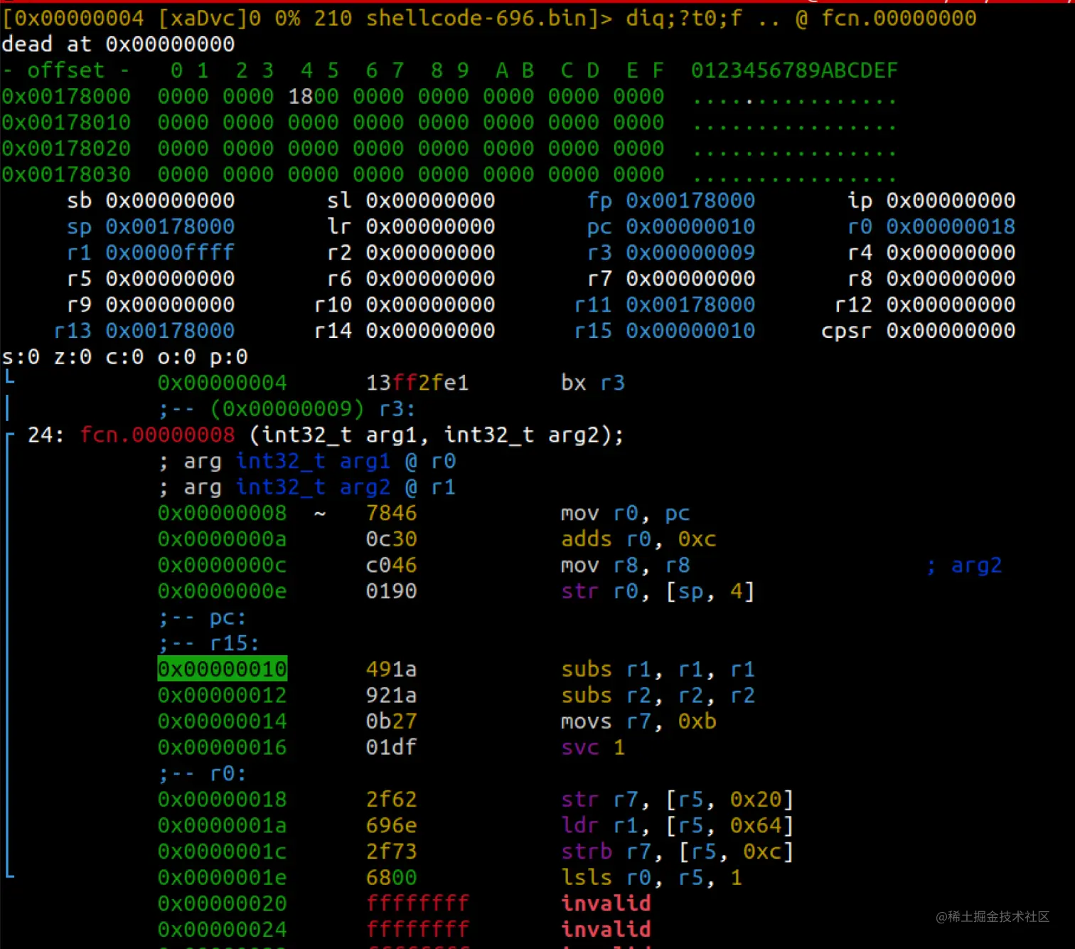 注意我们可以删掉前两条指令并使用全THUMB的shellcode。如果我们这样做,我们就可以在打开文件时设置 "e asm.bits=16",而不必再重新定义函数。只不过,如果需要的话,你可以区分这两种指令类型。