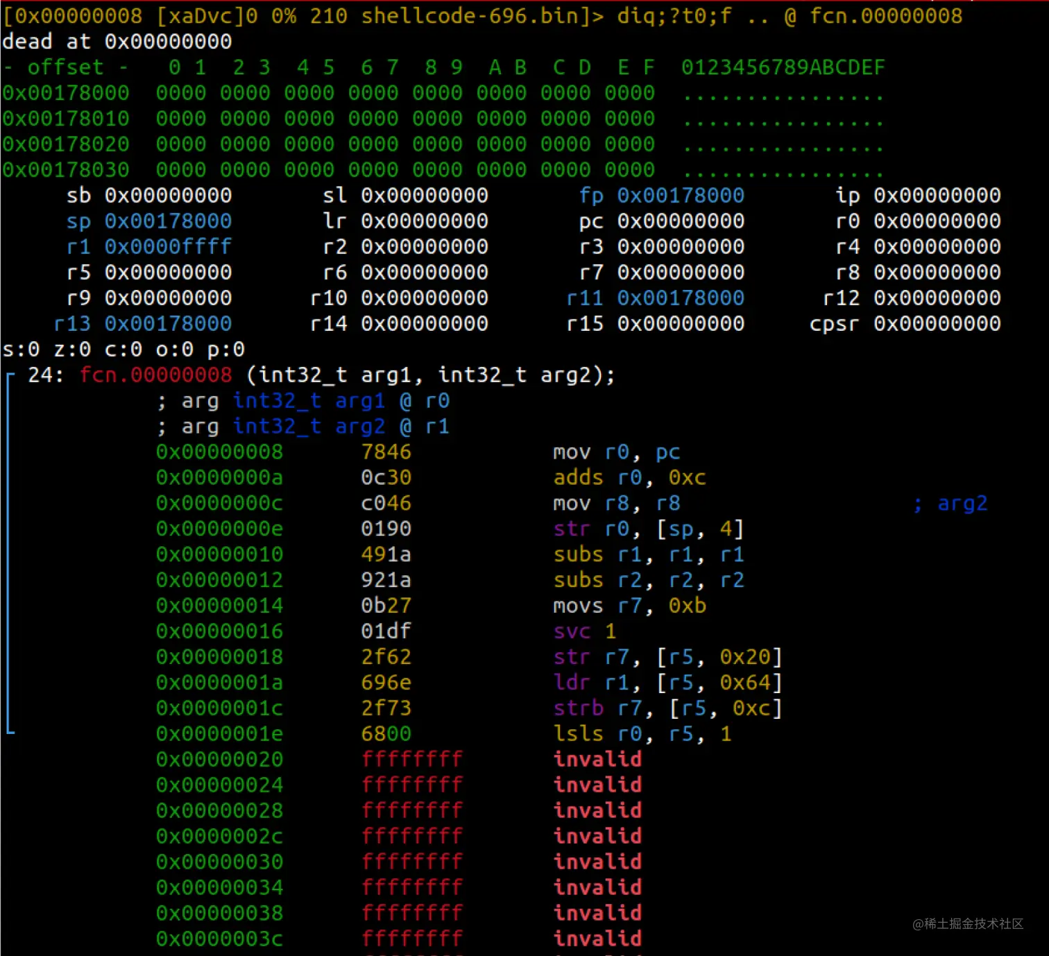 <p>[0x00000000]> s 8[0x00000008]> af[0x00000008]> pdf┌ 24: fcn.00000008 (int32_t arg1, int32_t arg2);│ ; arg int32_t arg1 @ r0│ ; arg int32_t arg2 @ r1│ 0x00000008 78460c30 andlo r4, ip, r8, ror r6│ 0x0000000c c0460190 andls r4, r1, r0, asr 13 ; arg2│ ┌─< 0x00000010 491a921a bne 0xfe48693c│ │ 0x00000014 0b2701df svcle 0x1270b│ │ 0x00000018 2f62696e cdpvs p2, 6, c6, c9, c15, 1└ │ 0x0000001c 2f736800 rsbeq r7, r8, pc, lsr 6[0x00000008]> afB 16</p>