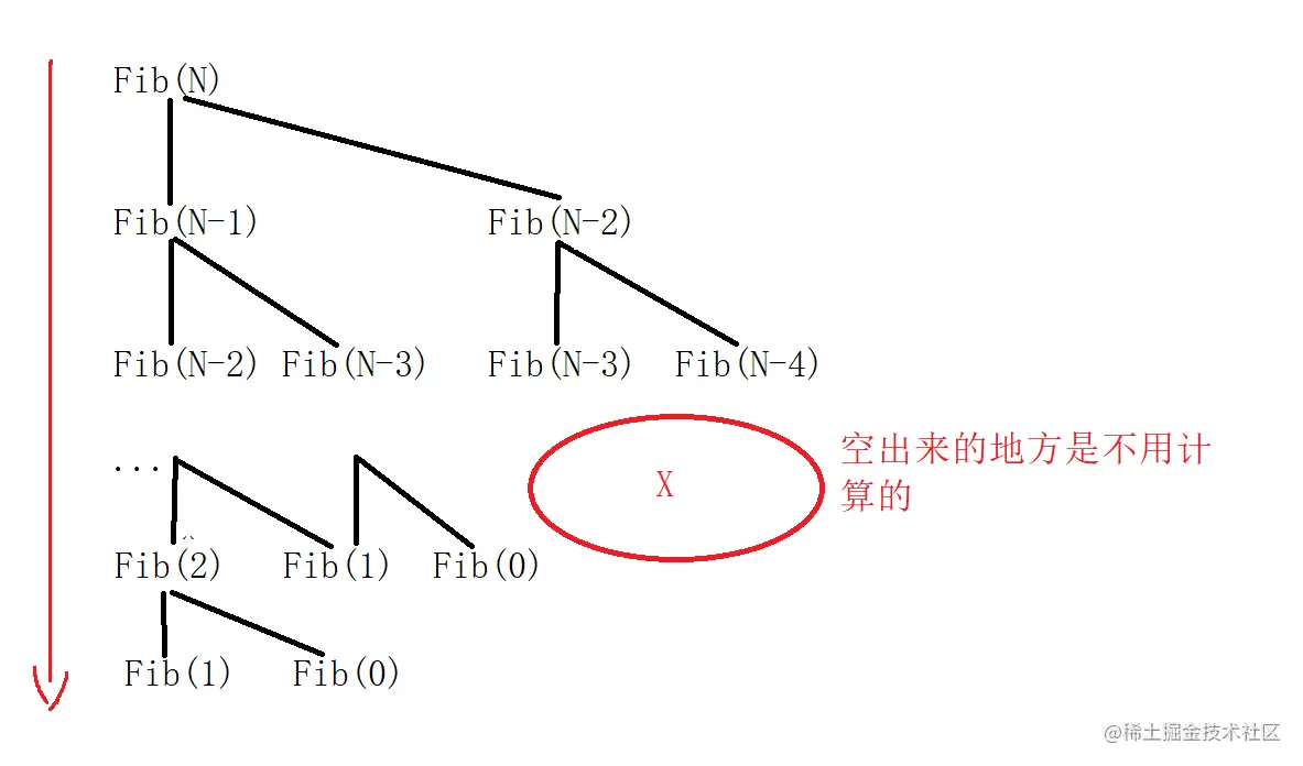 对于变量的创建和销毁来说,先创建Fib(N),再有Fib(N-1),再有Fib(N-2),一直往下走,最后创建Fib(2),Fib(1)。随后销毁之前创建的N个变量,再去创建Fib(N-1),到Fib(N-3),一直往下走,之后每一次创建的变量均小于第一次创建的N个变量个数,所以空间复杂度是O(N).