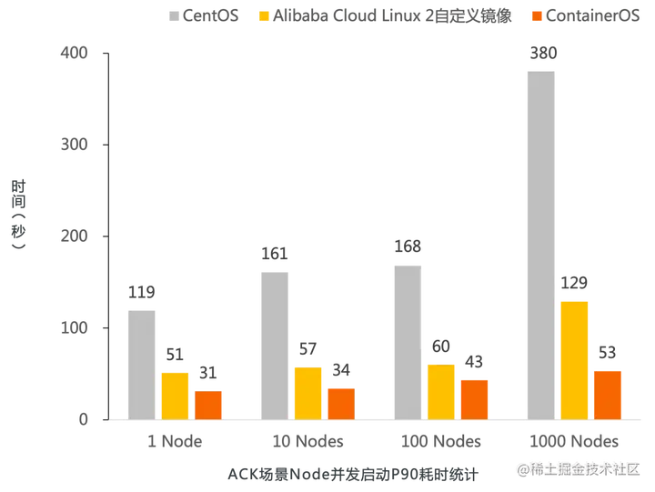 最终,统计了从空的 ACK 节点池扩容的端到端的 P90 耗时,从下发扩容请求开始计时,到 90% 的节点处于就绪状态结束计时,并对比了 CentOS、Alinux2 Optimized-OS [10] 方案,ContainerOS 性能优势明显,具体数据如下图所示。