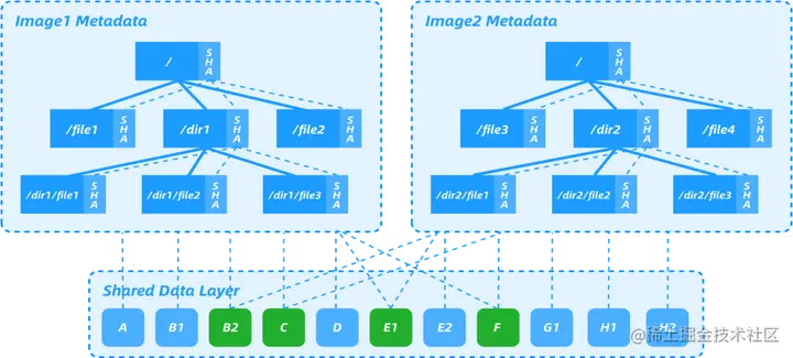 如上图 Nydus 镜像 1 和镜像 2 存在相同的数据块 B2、C、E1、F,镜像 2 新增 E2、G1、H1、H2,如果镜像仓库已经存在镜像 1,那么镜像 2 可以基于镜像 1 进行镜像构建,仅需要将 E2、G1、H1、H2 构建在一层,在上传的时候仅需要将这一层上传到镜像仓库,达到仅文件差异上传、拉取的效果,缩短研发周期。