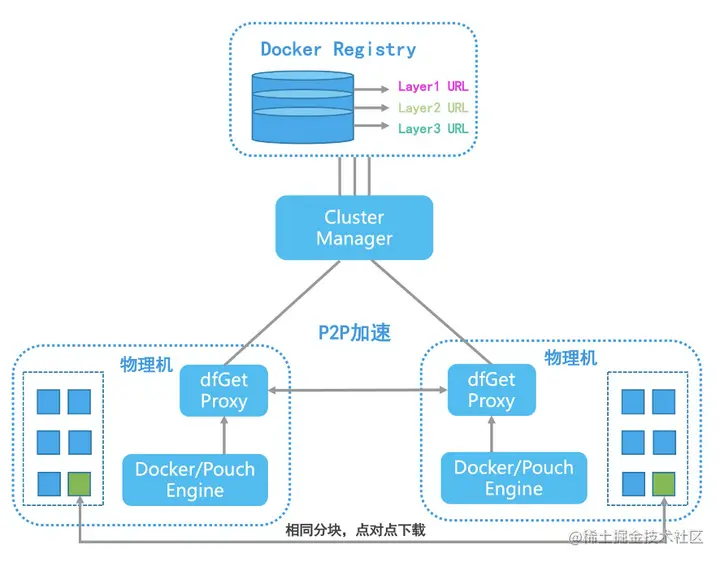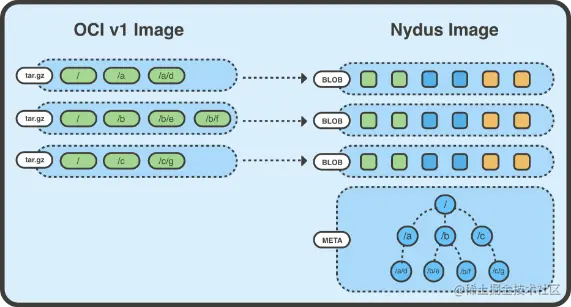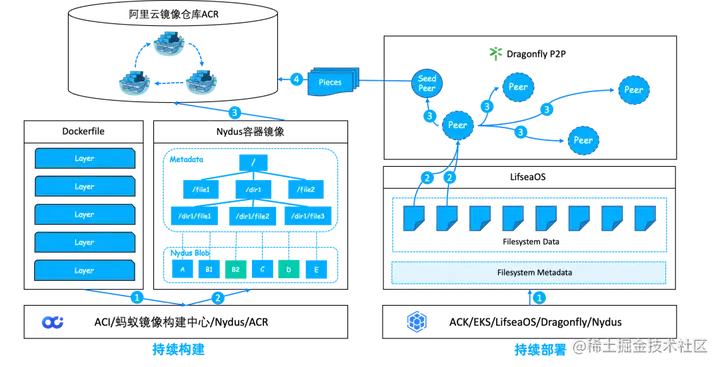 - 通过 Dragonfly P2P 网络对 Nydus 镜像块进行按需加速拉取。