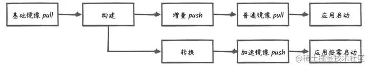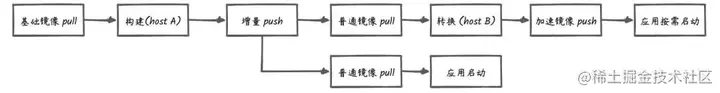 普通镜像构建完成并 push 到镜像仓库后,触发镜像仓库的转换动作,完成镜像转换。这种方案的缺点在于,构建和转换往往在不同机器上进行。镜像构建并 push 后,还需要 pull 到转换机并将产出 push 到镜像仓库,需要增加一次完整的镜像流转过程,延迟较高,而且还占用镜像仓库的网络资源。在加速镜像转换完成前,应用发布并无法享受加速效果,仍需要完整 pull 镜像。