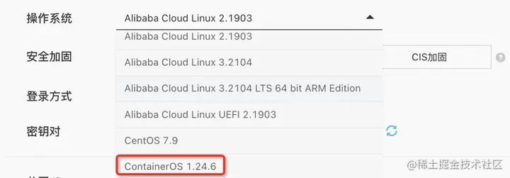 ContainerOS 基于龙蜥社区的 LifseaOS 项目开发,针对 ACK 集群节点池的弹性扩容场景,实现了极速扩容的特性。一方面,LifseaOS 通过简化 OS 本身的启动流程提高了 OS 启动速度。它裁剪掉了大量云上场景无需的硬件驱动,必要的内核驱动模块修改为 built-in 模式,去除了 initramfs,udev 规则也被大大简化,OS 首次启动时间从传统 OS 的 1min 以上下降到了 2s 左右。另一方面,ContainerOS 结合 ACK 场景进行了定制优化。它通过预置集群管控必备组件的容器镜像以减少节点启动过程中因镜像拉取而带来的耗时,并结合 ACK 管控链路优化(例如调节关键逻辑的检测频率、调整高负载下系统瓶颈中的限流值等),极大地提高了节点扩容速度。在阿里云控制台上为 ACK 集群建立托管节点池 [11] 时,在配置菜单中可以选择 ECS 实例的操作系统,下拉选择 ContainerOS 即可,OS 镜像名字中的 1.24.6 对应的是集群的 K8s 版本。另外,如果您需要高性能的节点池弹性扩容能力,为了实现最佳的节点扩容性能,更多信息请参见使用 ContainerOS 实现节点极速扩容 [12]。