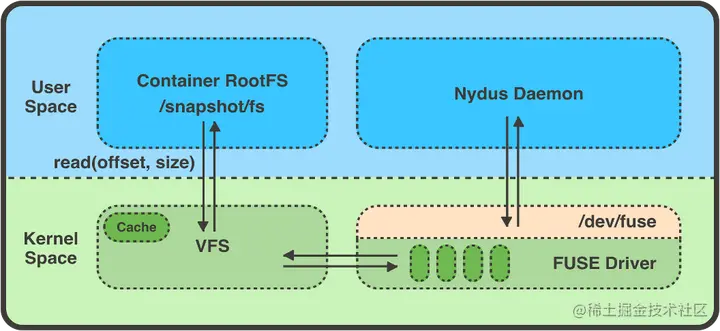 Nydus 默认使用用户态文件系统实现 FUSE [8] 来做按需加载,用户态的 Nydus Daemon 进程将 Nydus 镜像挂载点作为容器 RootFS 目录,当容器产生 read(fd,count) 之类的文件系统 IO 时,内核态 FUSE 驱动将该请求加入处理队列,用户态 Nydus Daemon 通过 FUSE Device 读取并处理该请求,从远端 Registry 拉取 Count 对应数量的 Chunk 数据块后,最终通过内核态 FUSE 回复给容器。Nydus 还实现了一层本地 Cache,已经从远端拉取的 Chunk 会解压缩后缓存在本地,Cache 可以做到以层为单位在镜像之间共享,也可以做到 Chunk 级别的共享。