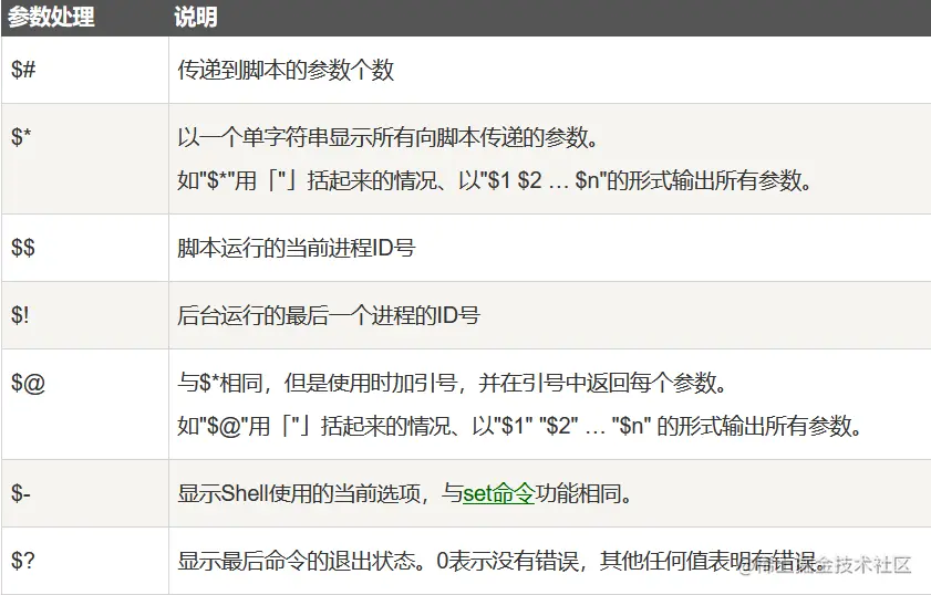 我们可以在执行 Shell 脚本时,向脚本传递参数,脚本内获取参数的格式为: $n。n 代表一个数字,1 为执行脚本的第一个参数,2 为执行脚本的第二个参数,以此类推……