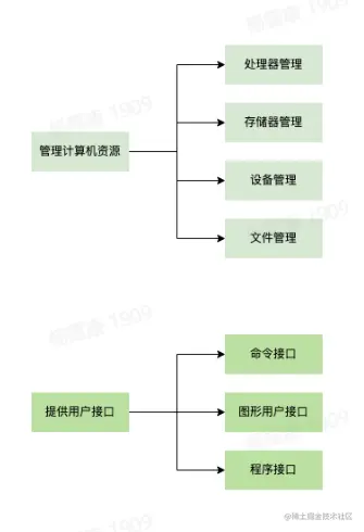- 管理计算机资源,包括处理器管理、存储管理、设备管理、文件管理等
