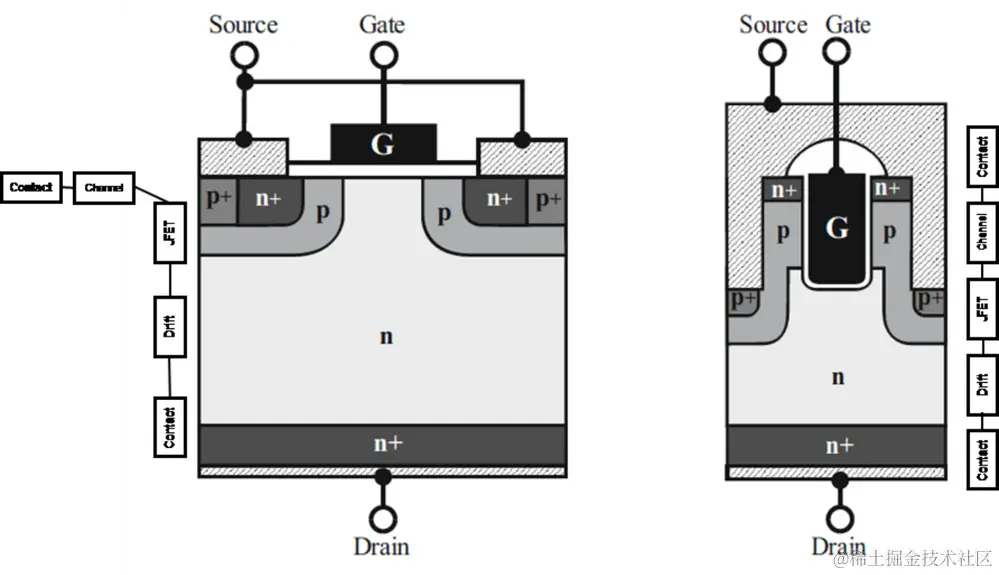 图2:平面DMOS SiC MOSFET(左)和垂直沟槽TMOS SiC MOSFET的剖面图,以及与电阻有关的贡献的相应位置