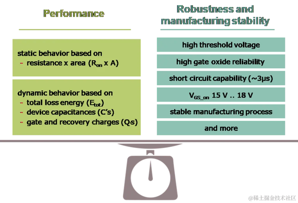 图1:SiC MOSFET的鲁棒性和制造稳定性(右)必须与性能参数(左)相平衡