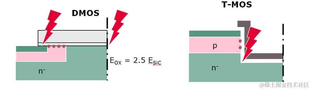 - 与硅器件相比,SiC器件在阻断模式下的漏极诱导电场要高得多(MV而不是kV)。这就需要采取措施限制栅极氧化物中的电场,以保持氧化物在阻断阶段的可靠性。另见图3:对于TMOS(沟槽MOSFET),薄弱点是沟槽拐角,而对于DMOS(双扩散金属氧化物半导体),薄弱点是元胞的中心。
