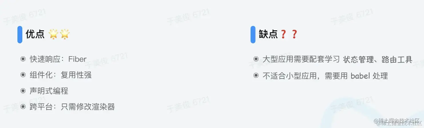 需要使用 JSX 语法,学习曲线较陡峭。此外,React 不适合单独做一个完整的框架,做大型项目需要和其他框架组合使用。